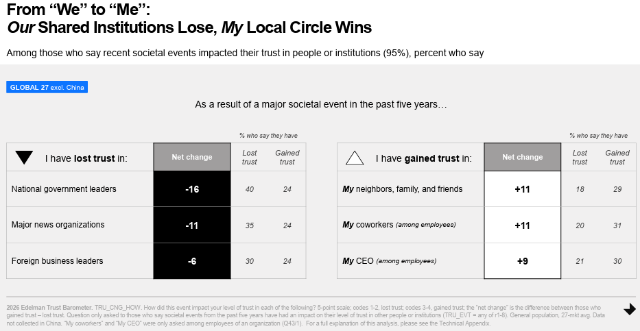 Huddle Closer: According to the 2026 Edelman Trust Barometer, global audiences are turning inward – trusting only their closest circles, from friends to coworkers. Trust in government leaders is plummeting as a result of major world events occurring in the past five years. Even major news organizations have felt the heat of this change.