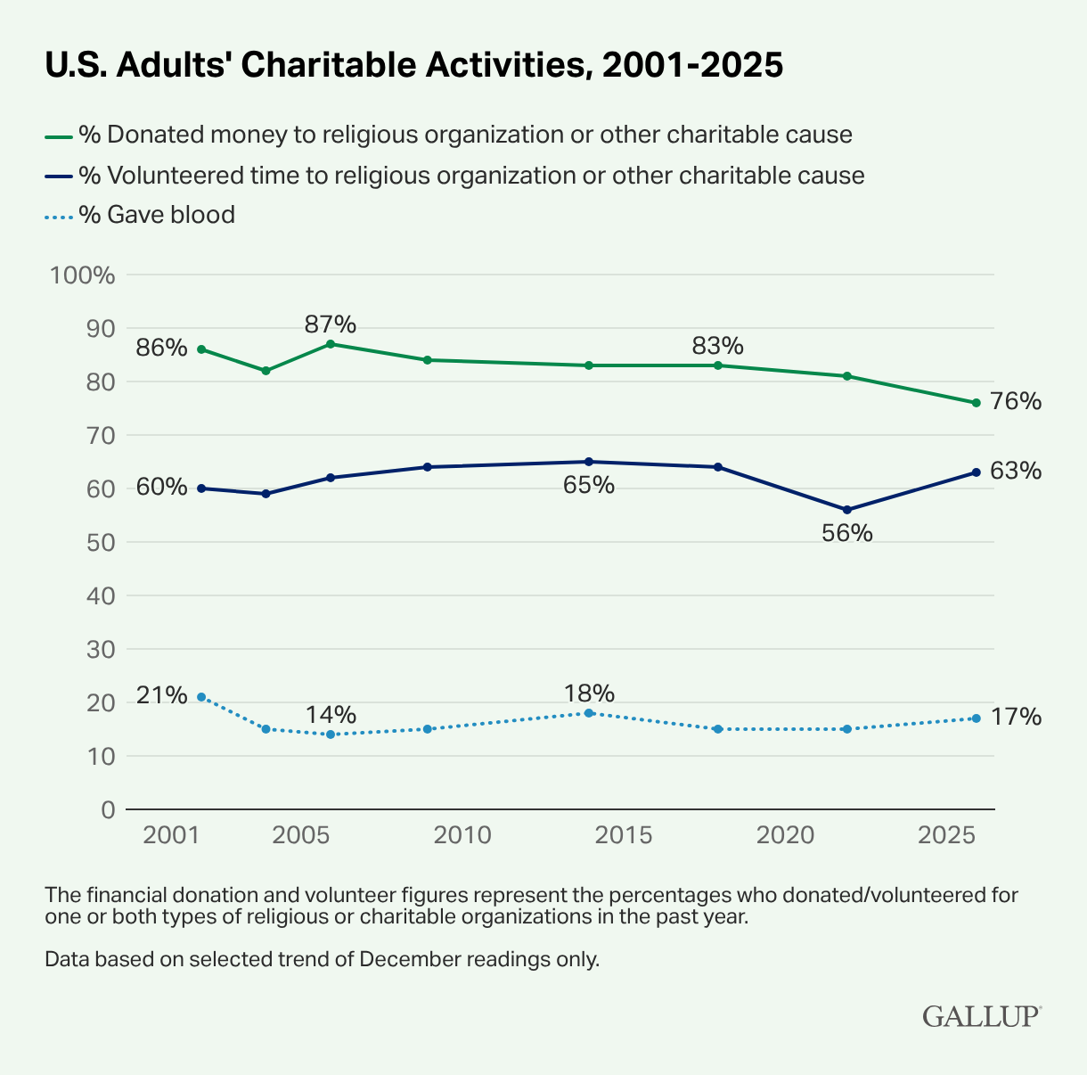 Opening our hearts, and our pockets. We’re donating our time and our money, too. Charitable donations, while slightly down from 2021, are still high with 76% of Americans who have donated money to a charitable cause in the last five years. Meanwhile, volunteering is on the way up, with 63% of Gallup respondents saying they’ve done so. While financial donations may skew to a wealthier population, the point still stands: the majority of Americans are willing to help those in need in their communities, despite the personal financial hardships they may be feeling.
