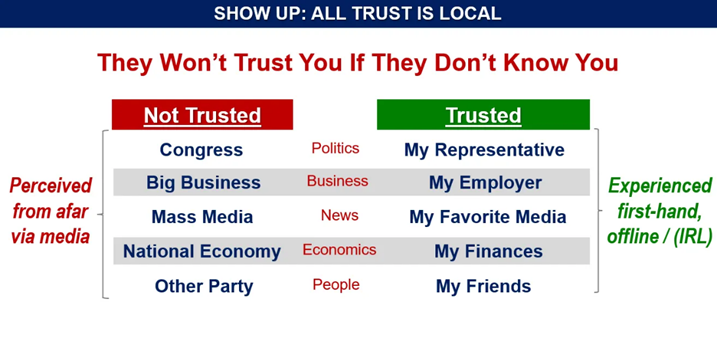 “Yet, trust is a funny thing,” says Mehlman. “People hate Congress but trust their own Congressperson. They don’t trust big business but trust their own employer most. We don’t trust the ‘mass media’ but trust the podcasters we listen to and Substacks we read. We have confidence in our own doctor but despise the ‘healthcare system.’ Why? It’s based on how we engage them. We don’t trust those things we perceive from afar, through the lens of a media incentivized to keep us reading, watching and listening via drama and outrage…By contrast we trust those things we experience in real life, firsthand, offline.”