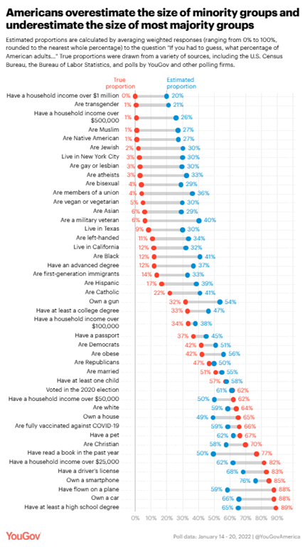 On a related note, we think 62% of Americans have a household income greater than $50,000. In reality, 50% of Americans actually do.